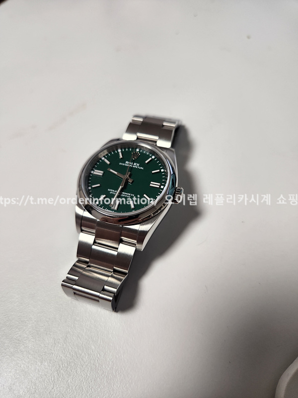 사장님에게 추천받은 오이스터 퍼페츄얼 36mm 그린입니다. 다이얼 색감이며 바인덱스며 퀄이 거의 완벽수준에 가깝습니다.역시 사장님한테 추천받길 잘했습니다. 너무 만족스럽네요. 현재 3개짼데 하나더 구매예정입니다!