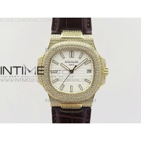 파텍필립 노틸러스 점보 5711 풀다이아몬드 옐로우골드 화이트다이얼 악어가죽스트랩 NAUTILUS JUMBO 5711 YG FULL PAVED DIAMONDS WHITE DIAL CASE ON BROWN CROCO LEATHER STRAP A324