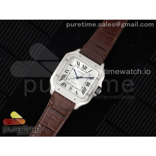 3K공장 까르띠에 산토스 라지 40 스틸 다이아몬드베젤 화이트다이얼 가죽스트랩 Santos de Cartier 40mm 3KF 1:1 Best Edition White Dial Diamonds Bezel on Brown Leather Strap MIYOTA 9015