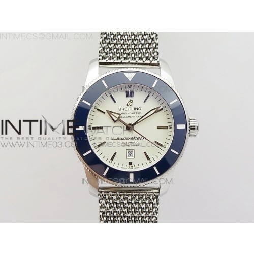 브라이틀링 슈퍼오션 헤리티지 스틸 화이트다이얼 블루세라믹베젤 매쉬밴드 SUPER OCEAN HERITAGE BLUE CERAMIC BEZEL SS WHITE DIAL ON SS BRACELET A2824 > 브라이틀링