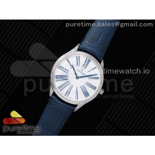 오메가 드빌 트레소르 퀴츠 화이트다이얼 블루마커 가죽스트랩 De Ville Tresor Quartz 36mm Ladies SS White Dial Blue Markers on Blue Leather Strap Ronda Quartz