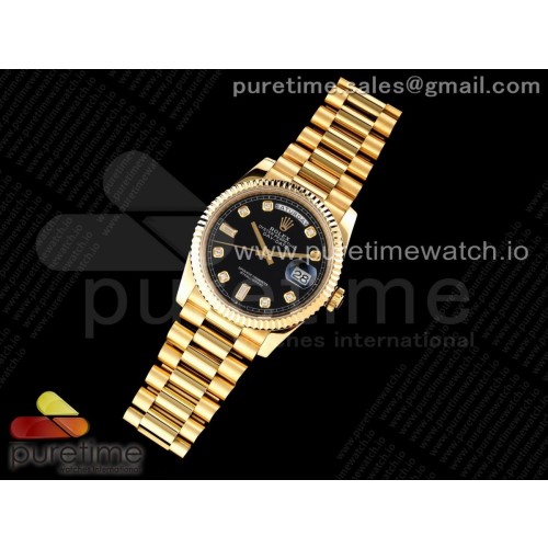 GM공장 롤렉스 데이데이트 36 옐로우골드금통 블랙다이얼 2836 Day Date 40 YG 904L Steel Fluted Bezel GMF 1:1 Best Edition Black Diamonds Dial on YG Bracelet A2836