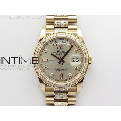 BP공장 롤렉스 데이데이트 36 옐로우골드 금통 다이아몬드베젤 2열 다이아몬드브레이슬릿 실버다이얼 2836 Day-Date 36 128235 YG/Crystal BP Best Edition Silver Crystal Marker Dial on YG President Bracelet A2836