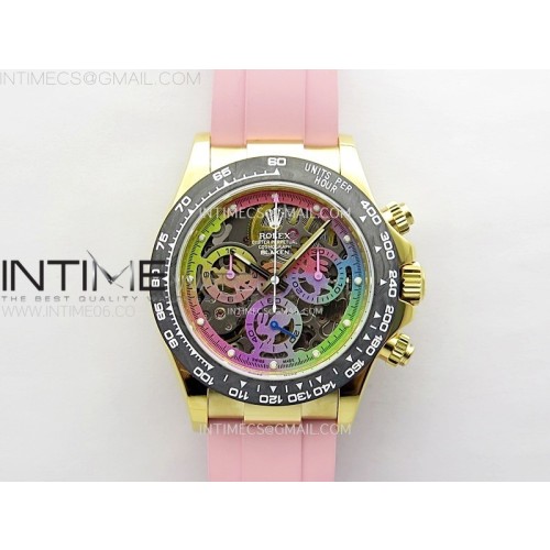 GET공장 롤렉스 데이토나 옐로우골드금통 컬러스켈레톤다이얼 러버스트랩 Daytona PVD Carbon Bezel YG GETF Best Blacken Skeleton Color Dial on Pink Rubber Strap SA4130